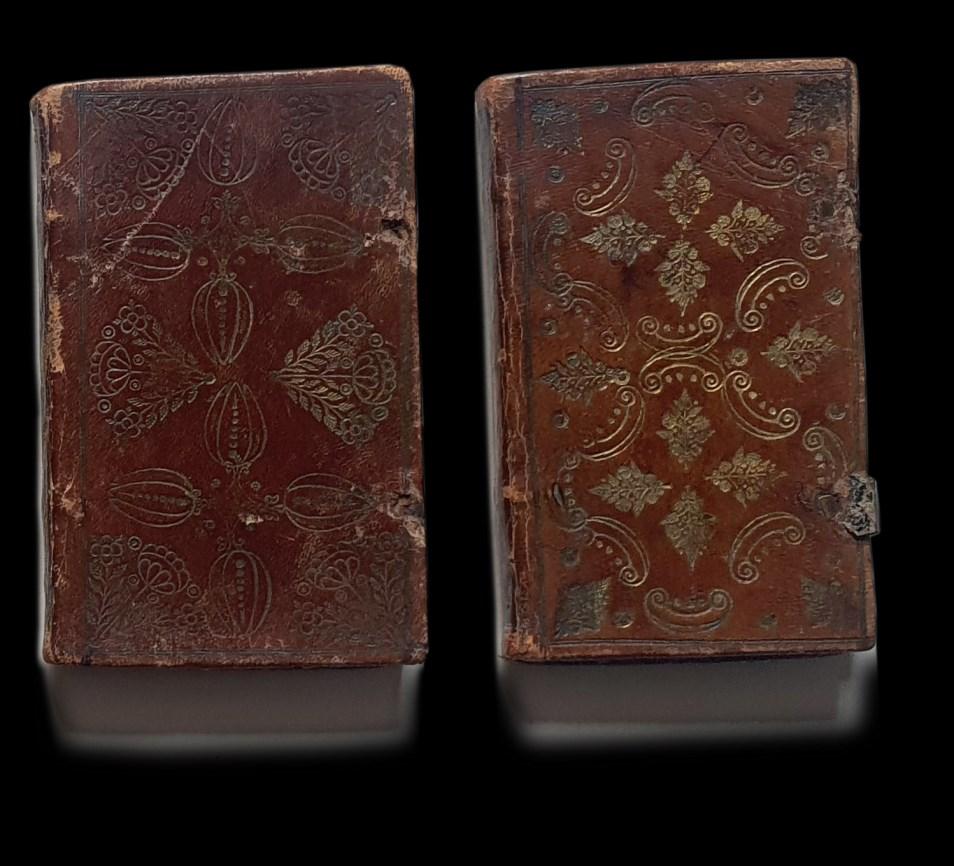 The contemporary gilt-tooled sheep bindings in this set are both unusual and intriguing, in that they diverge from the typical bindings – either very plain or elaborately tooled morocco – found on almanacs. All of these volumes are bound in contemporary light tan sheep (some with marbled endpapers), with gilt tooling typical of the later part of the 17th century: small tools, including drawer handles and floral shapes, and even the occasional bird, are combined into geometric designs. Each of these differs from the others, but all share what may be called a “family resemblance”; David Pearson has confirmed that they
