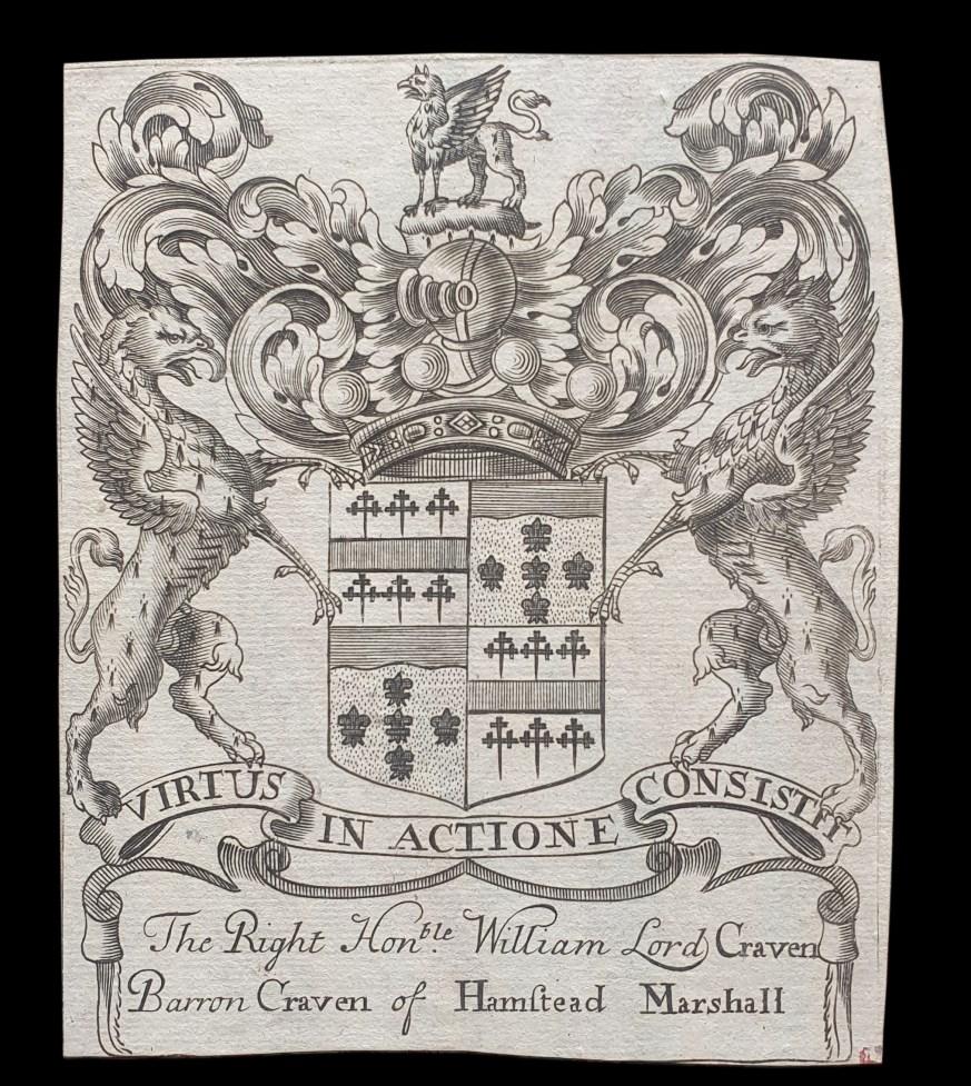 Provenance: Title page reads “The Lady Cravens Receipt-Booke”. Unusually large armorial bookplate to paste-down of “The Right Honble William Lord Craven Barron Craven of Hamstead Marshall”, with the motto “Virtus in actione consistii”.