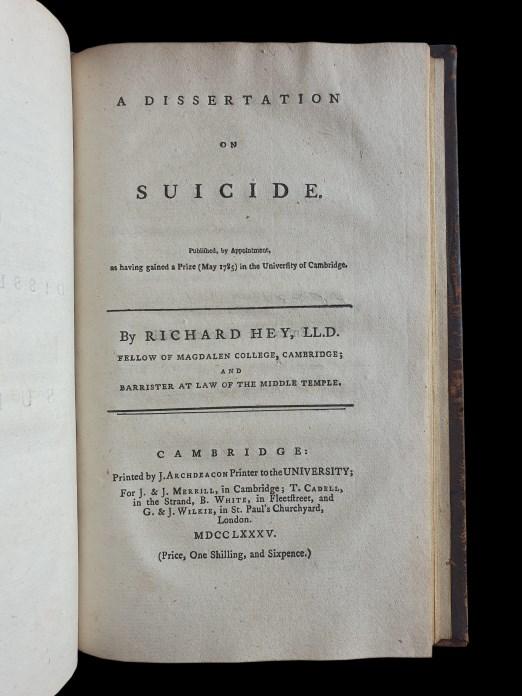 A Dissertation on Suicide. Cambridge: J. Archdeacon for J. & J. Merrill & T. Cadell, 1783. First edition. Contemporary tree calf.