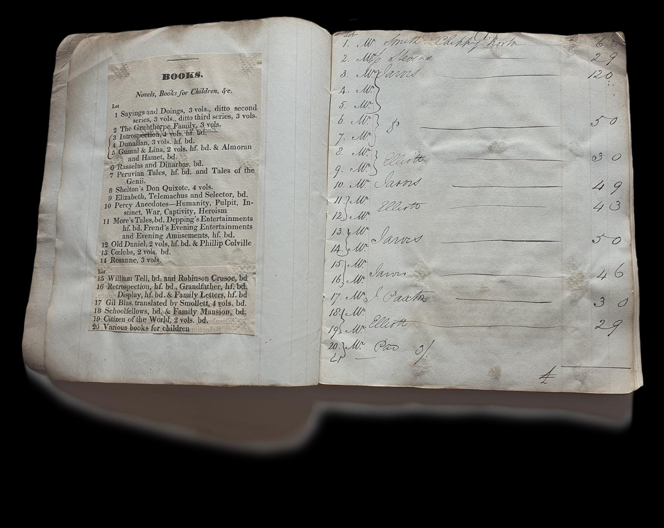 Paxton’s close colleague “Smith Printer” bought nine lots, including “297 Dictionary of Arts and Sciences, 8vs” for “15s” as well as Hind’s Arithmetic, Moore’s Juvenal, Edinburgh Dispensatory (342-344), and several others, so was perhaps selling books from his premises in Bicester as well as printing, among other things, Paxton’s sale catalogues. The scribe has prewritten “Mr” before each entry, but lot 35 (“Italian Pocket Dictionary and Zotti’s Italian Grammar”) has been amended to “Miss” followed by “Elliston” who paid “4s 6d” – an unusual, early record of a woman purchasing at auction.
