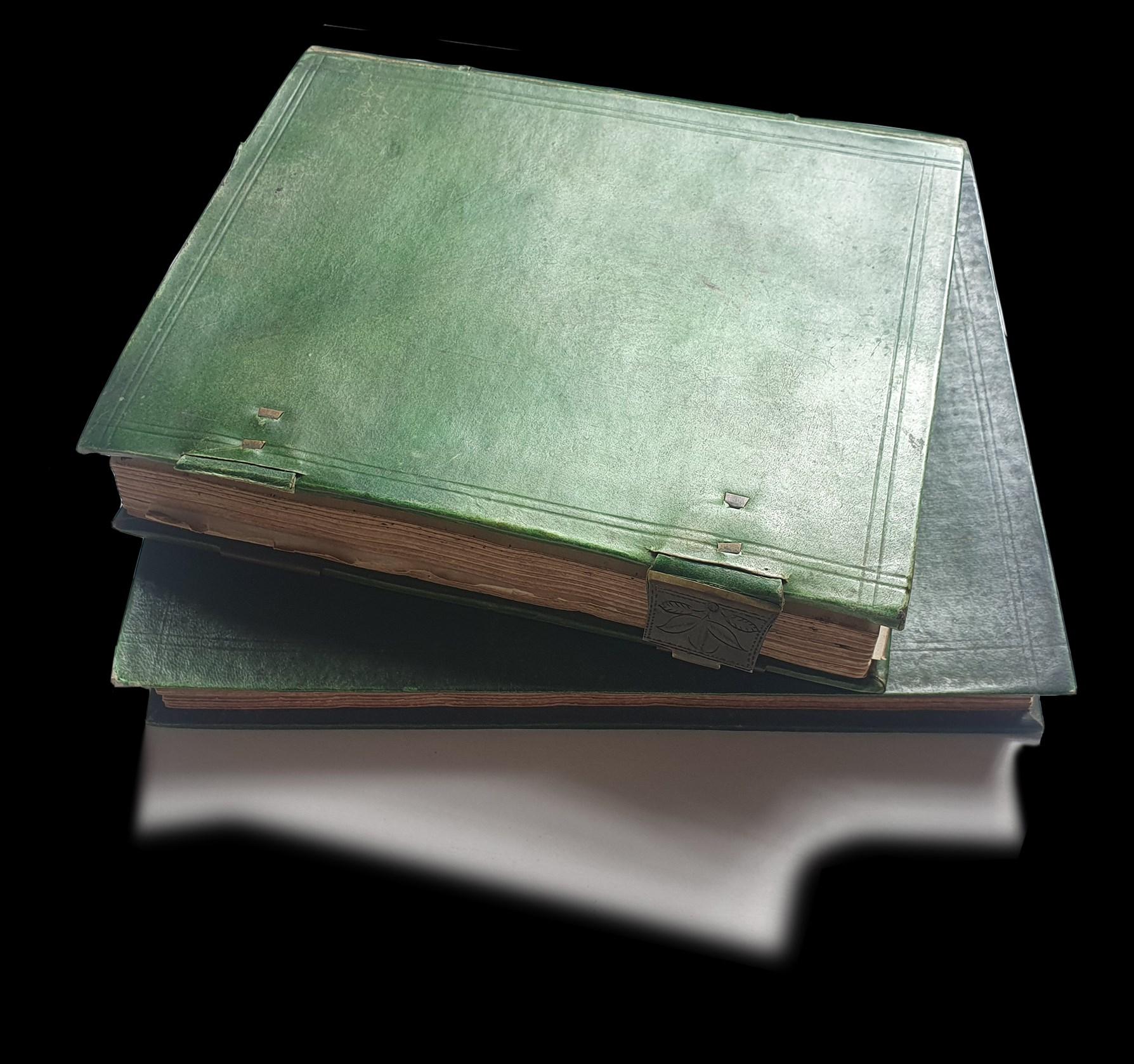 [Cira 1800-20]. Quarto (195 x 160 x 25 mm). 170 leaves (of which approximately 40 pages are in manuscript text or calculations and 68 pages of printed scraps), a few leaves excised. Contemporary green vellum. Watermark: Britannia, letters MB beneath.