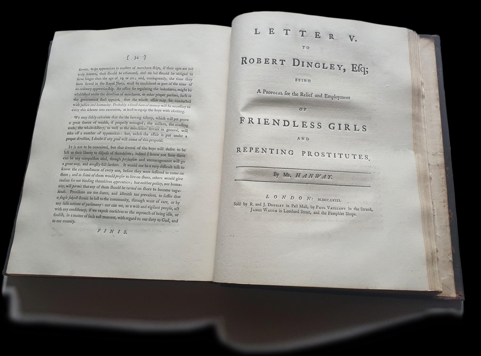 ¶ This is a scarce, complete and handsome set of Jonas Hanway's five letters on two of his most dearly held philanthropic enterprises: the Marine Society, which he established in 1756 to equip and prepare destitute men and boys for a livelihood at sea (four letters); and the Magdalen Hospital for Penitent Prostitutes, which he co-founded in 1758 (the fifth and final letter). Each has a separate title page, pagination, and register.