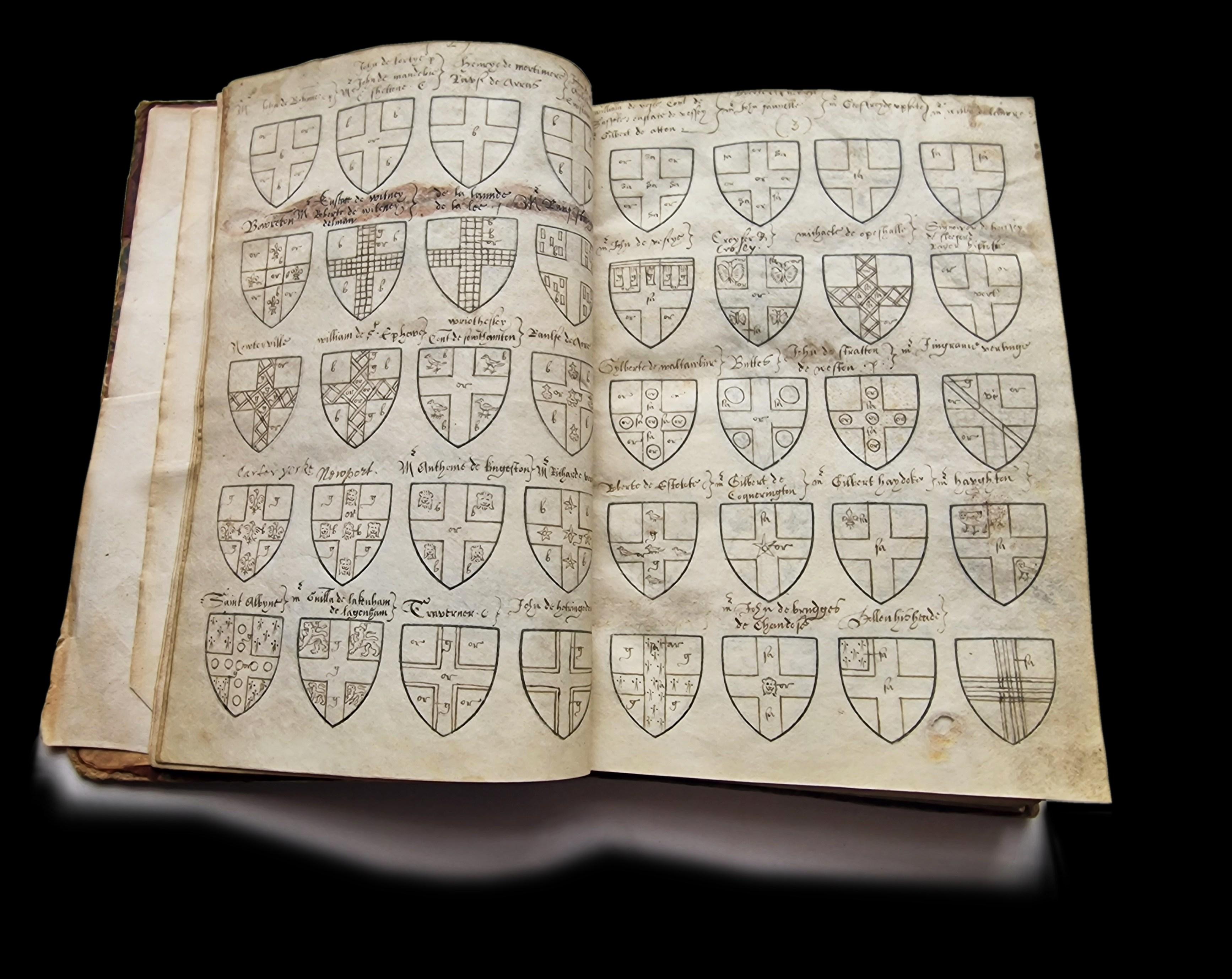 The heraldic tradition, so concerned with establishing provenance and origins, itself is based upon documents with often uncertain origins. Several questions about our manuscript remain unanswered: who was the 16 century scribe? What source material were they using? Why did they lavish so much attention on small details? And how did a 16th-century ordinary end up in the house of a provincial chandler? Further research may illuminate some of these dark corners, but in the meantime, its attractions are many and its puzzles compelling.