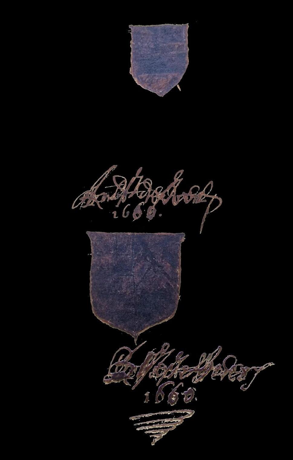 The paper endleaves are watermarked with a coat of arms matching Haewood 418, which he dates to 1602. A 17thcentury scribe has added a two-page table of charges at the beginning, and a 17-page alphabetical index of names at the end, together with a couple of perplexing additions. The first of these is to the verso of the first vellum leaf, where he has written a couple of notes (one with a section of decorative border). These have been scribbled out (probably by the same scribe), which makes a transcription somewhat challenging, but they appear to say “Aequest Reesten[es] 1660” and “Reste Destes 1660”. At the end of the volume, there are two shields with annotated notes beneath. The shields have been entirely inked out and, again, the inscriptions scribbled over leaving only the date “1660” (to both) and the blackened, ghostly images which can be tantalisingly glimpsed in the light.