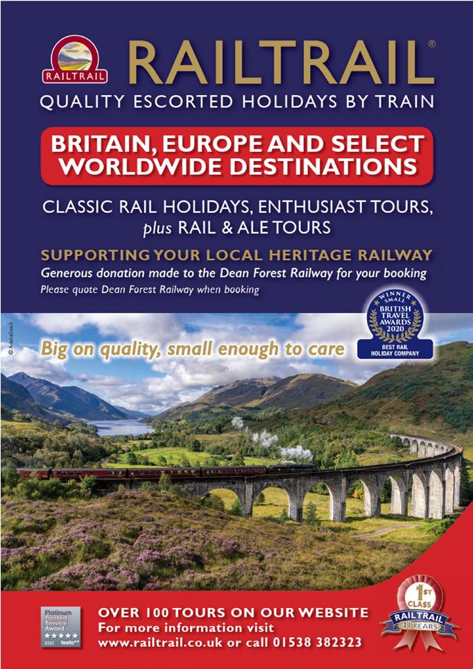It’s that time of year again! Following last year’s successful trial, we have decided to stick to the format of two, shorter, draws for 2023. With this mailing you will find some tickets enclosed. As usual, please help your Society by either purchasing them yourselves, or selling to family and friends. Stubs and monies can be returned in the envelope enclosed. Cheques should be made payable to ‘Dean Forest Railway Society’. The proceeds from the draw will be invested into projects and improvements around the railway - please help support the draw to raise vital funds for your railway. If you do not wish to take part, please return the unsold tickets as we can reuse them for on-train sales, which are already underway organised by our Raffle Co-Ordinator Stan Rudge.