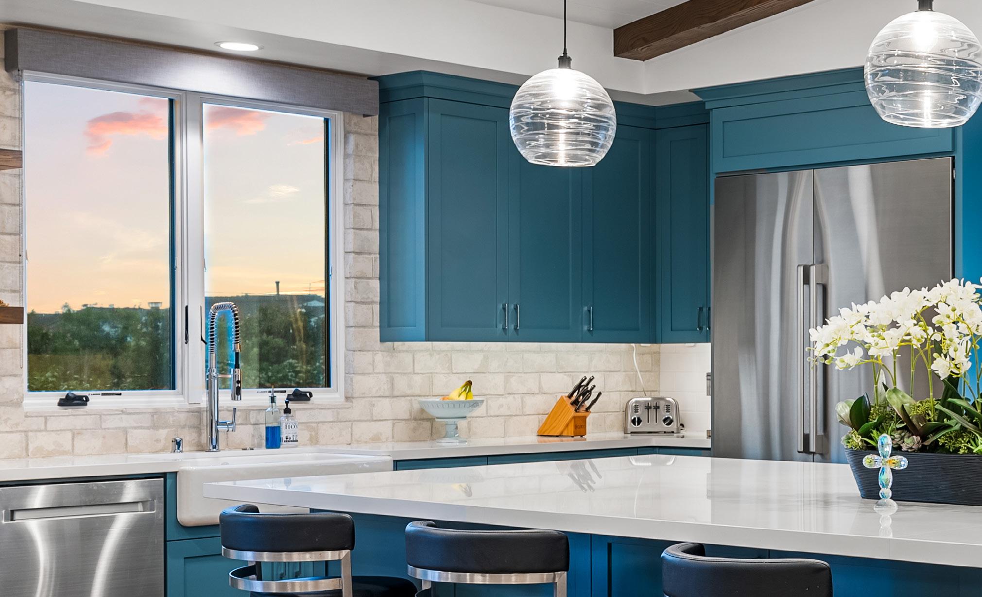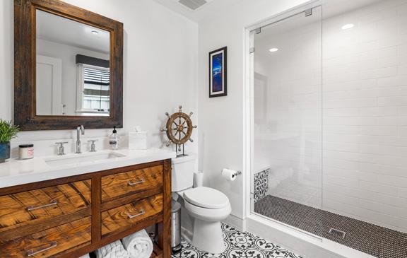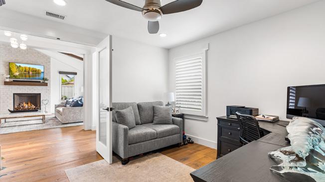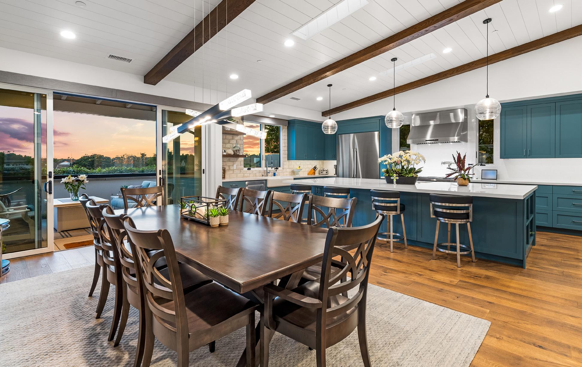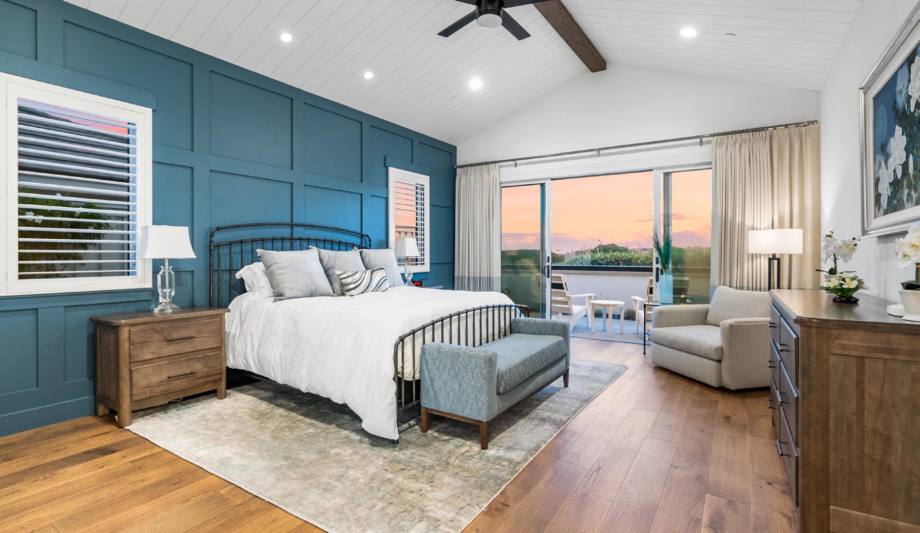 Completely rebuilt, expanded and reimagined in 2021, this rare single-level, cul-de-sac, view home in Corona del Mar’s desirable Harbor View Hills South community showcases timeless Modern Farmhouse style with distinctive coastal flair. New white see-through fencing elevates curb appeal and introduces the residence’s welcoming front courtyard, where al fresco dining and entertaining can be enjoyed around a massive contemporary fireplace. Board-and-batten siding and a black standing-seam metal roof complement the design’s aesthetic, which continues inside throughout approximately 3,044 square feet. A classic Dutch door leads the way to an open-concept great room floorplan with high vaulted beam ceilings, four bedrooms and three-and one-half baths. Main areas include a living space with impressive brick fireplace that opens to the front patio, and a spacious dining area that flows effortlessly into the kitchen. Novice and pro chefs alike will appreciate an enormous 6’ by 13’ island, custom Shaker cabinetry, quartz countertops, generous storage space, walk-in pantry with barn door, and top-tier Dacor appliances including a range and built-in refrigerator. A centrally located wet bar offers a Dacor vertical wine unit for convenience.