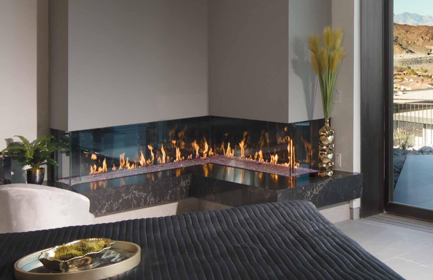 LEFT AND RIGHT CORNER CONFIGURATIONS: THIS LAS VEGAS HOME BRINGS TOGETHER TWO INDIVIDUAL DAVINCI CORNER INSTALLATIONS, DIVIDED BY A SLIDING GLASS WALL, TO FORM A MODERN INDOOR-OUTDOOR INTERPRETATION OF FIRE BEFITTING THE HOME’S LOCATION.