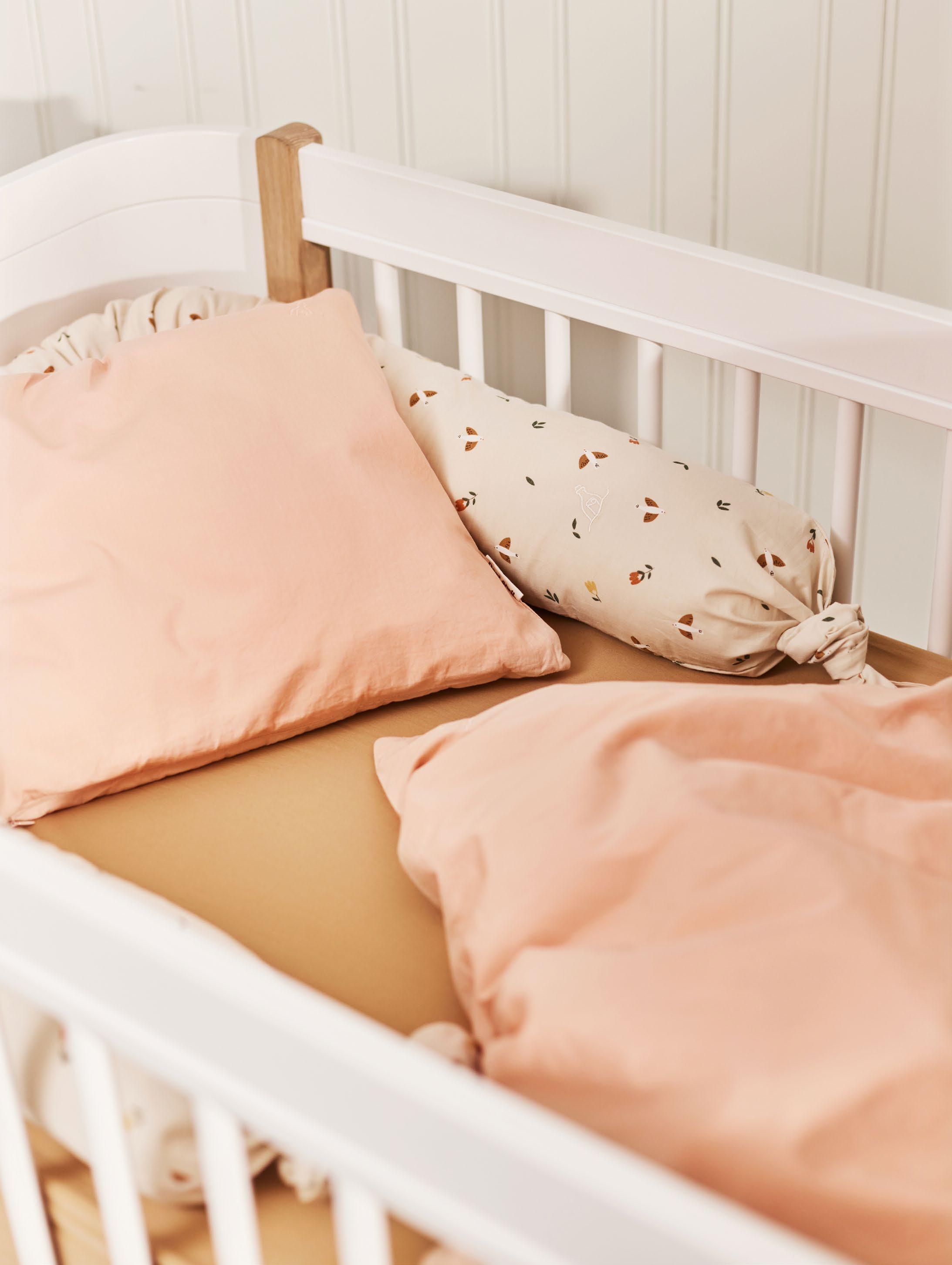 Soft bed linen in 100% organic cotton percale. The dense percale weave is not only durable and beautiful to look at but also lightweight and breathable. The bed linen is pre-washed, which gives a natural crinkled look and makes it incredibly soft against the skin, and it only gets softer the more it is used. The pillowcase has a zipper for the baby and junior sizes, while the duvet cover closes with fine ribbons. The adult-size pillowcase has an envelope closing, and the duvet cover closes with a zipper. All bedding is produced in India and GOTS-certified.