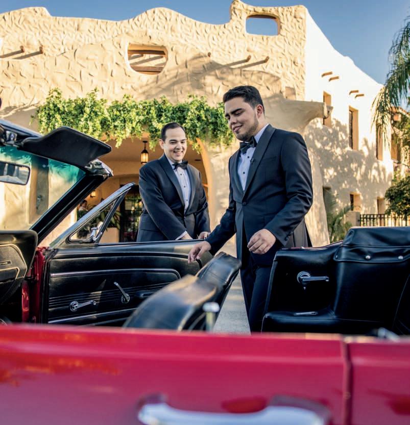 Al ser declarados esposos, caminaron en una procesión que siguió a un Mustang rojo antiguo, manejado por los novios. Luego de pasar el foyer eran recibidos con una copa de prosecco, y las melodías de un grupo tradicional que entonó “Volare”, “Funifulí Funiculá” y la “Tarantella napolitana”, entre otras melodías, con acordeón, mandolina y clarinete. En un salón conjunto tenían ubicado un glam room, con una estación de maquillaje y de pintura, donde la artista Liliana Rangel retrataba los looks de los invitados como sketches de diseñador. Allí, a manera de un pequeño museo, estaban dispuestos los recuerdos que iban contando la historia de amor de la pareja, además de objetos preciados familiares, libros de moda, flores y vestidos de la última colección inspirada en Italia, de la diseñadora dominicana Giannina Azar.