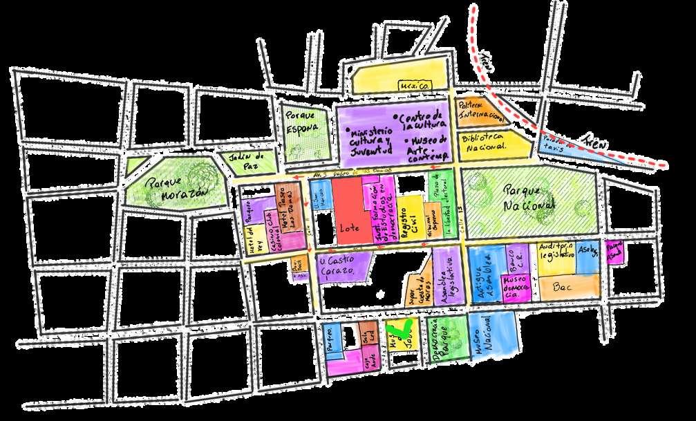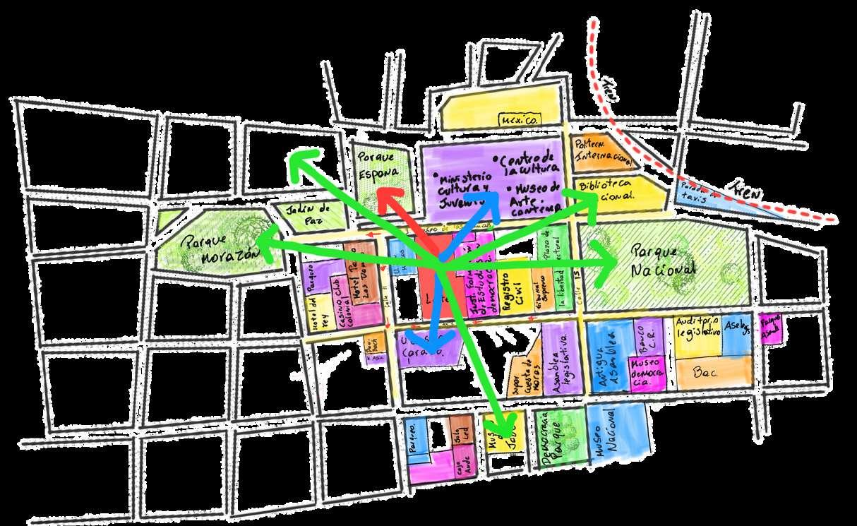 Parque Nacional Monumento nacional Biblioteca Nacional U.San Marcos. Parque Morazán. Jardín de Paz. Parque España U. Castro Carazo. Asamblea Legislativa. Hotel el rey.