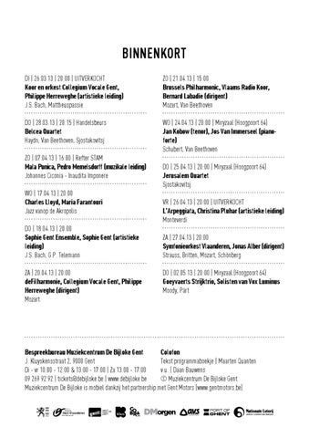 Bespreekbureau Muziekcentrum De Bijloke Gent Colofon J. Kluyskensstraat 2, 9000 Gent Tekst programmaboekje | Maarten Quanten Di - vr 10:00 - 12:00 & 13:00 - 17:00 | Za 13:00 - 17:00 v.u. | Daan Bauwens 09 269 92 92 | tickets@debijloke.be | www.debijloke.be © Muziekcentrum De Bijloke Gent Muziekcentrum De Bijloke is mobiel dankzij het partnership met Gent Motors (www.gentmotors.be)