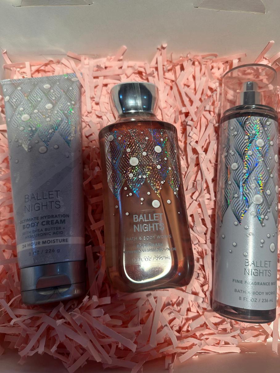 Consta de una crema un perfume y un gel de baño (aroma Ballet Nights) todo marca Bath and body, viene con una caja decorada con papel picado dos tarjetas del dia de la madre y un lazo.