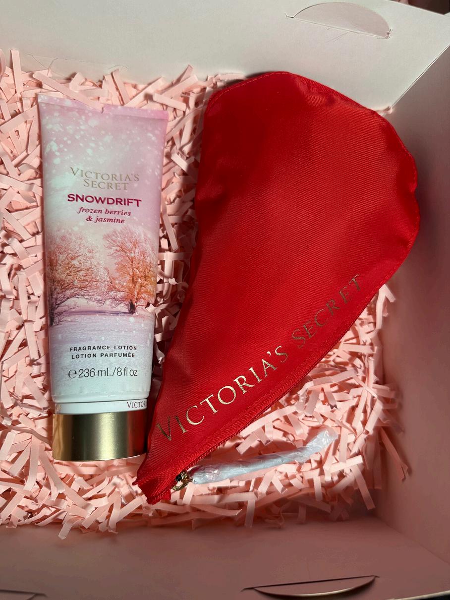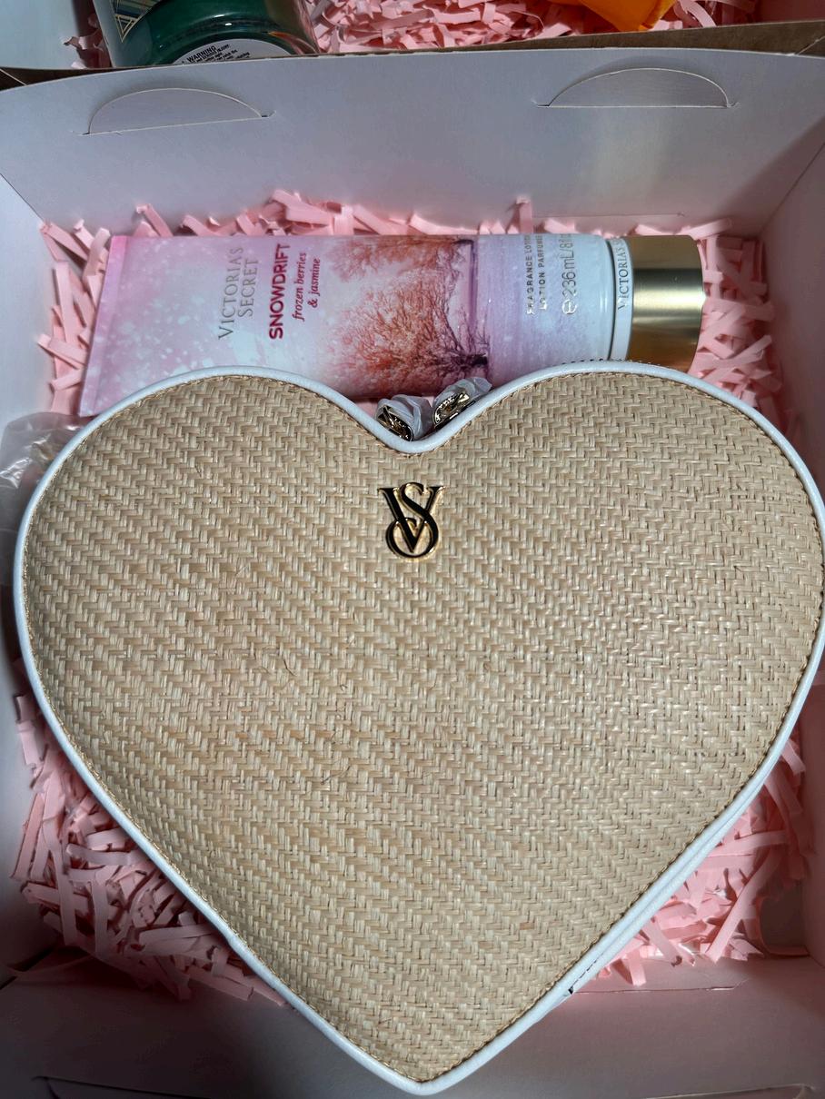 Consta de un bolso (Heart Crossbody Bag) y una crema a escoger entre todo el catalogo, todo marca Victoria Secret, viene con una caja decorada con papel picado dos tarjetas del dia de la madre y un lazo.