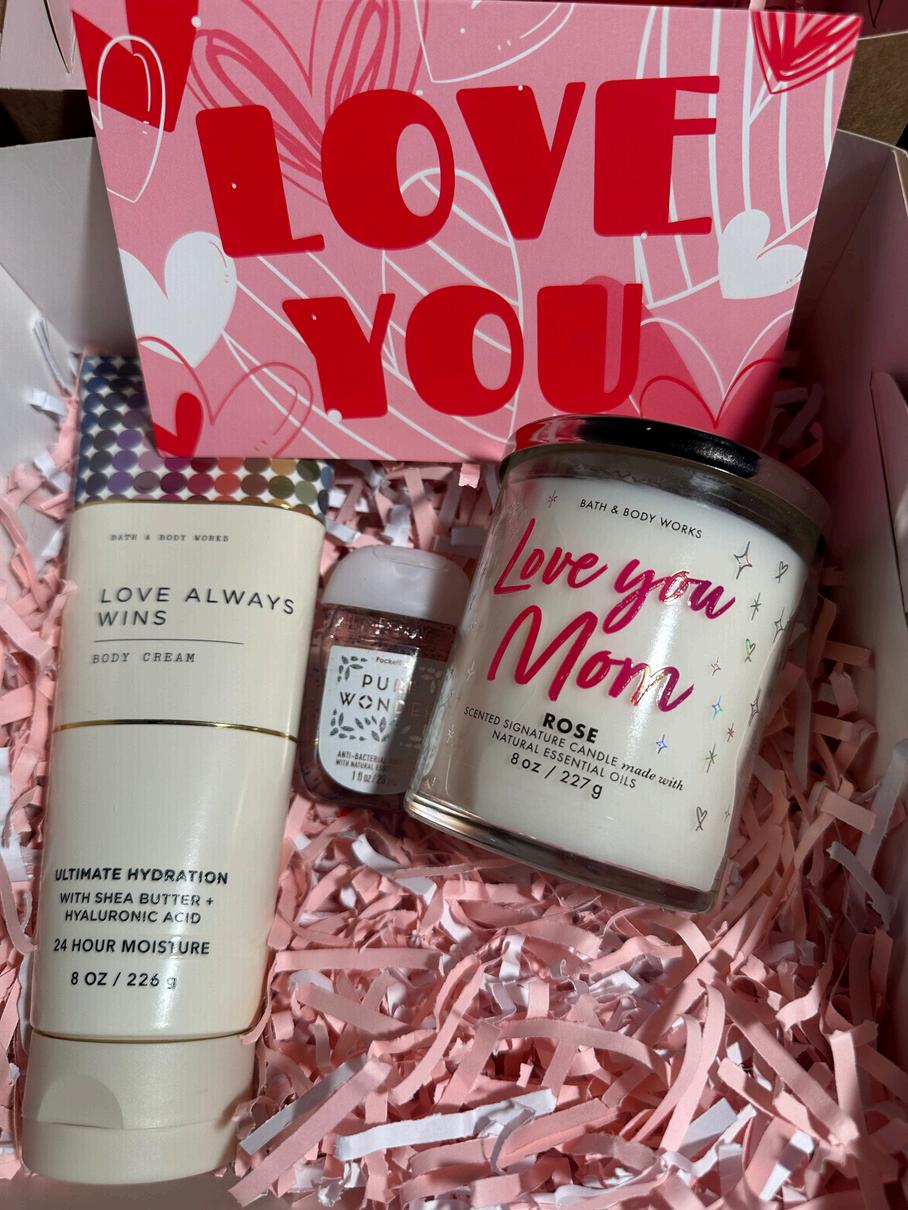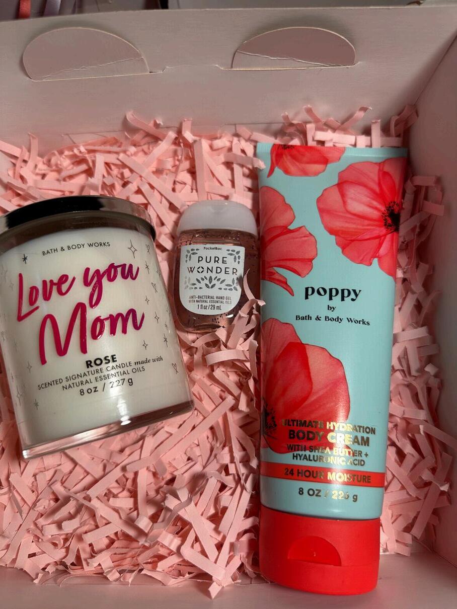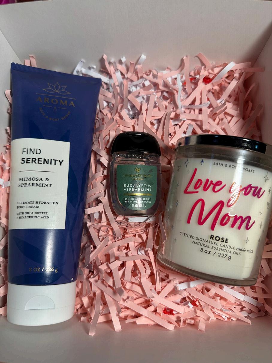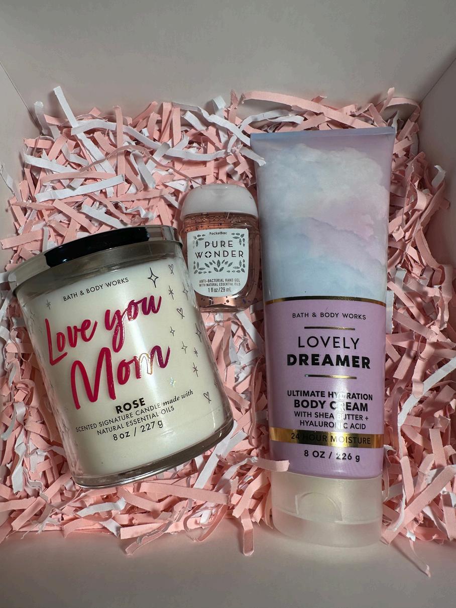 Consta de una crema a escoger entre todo el catalogo, una candela edición especial Día de la madre y un alcohol en gel todo marca Bath and body, viene con una caja decorada con papel picado dos tarjetas del dia de la madre y un lazo