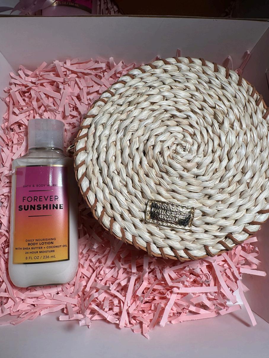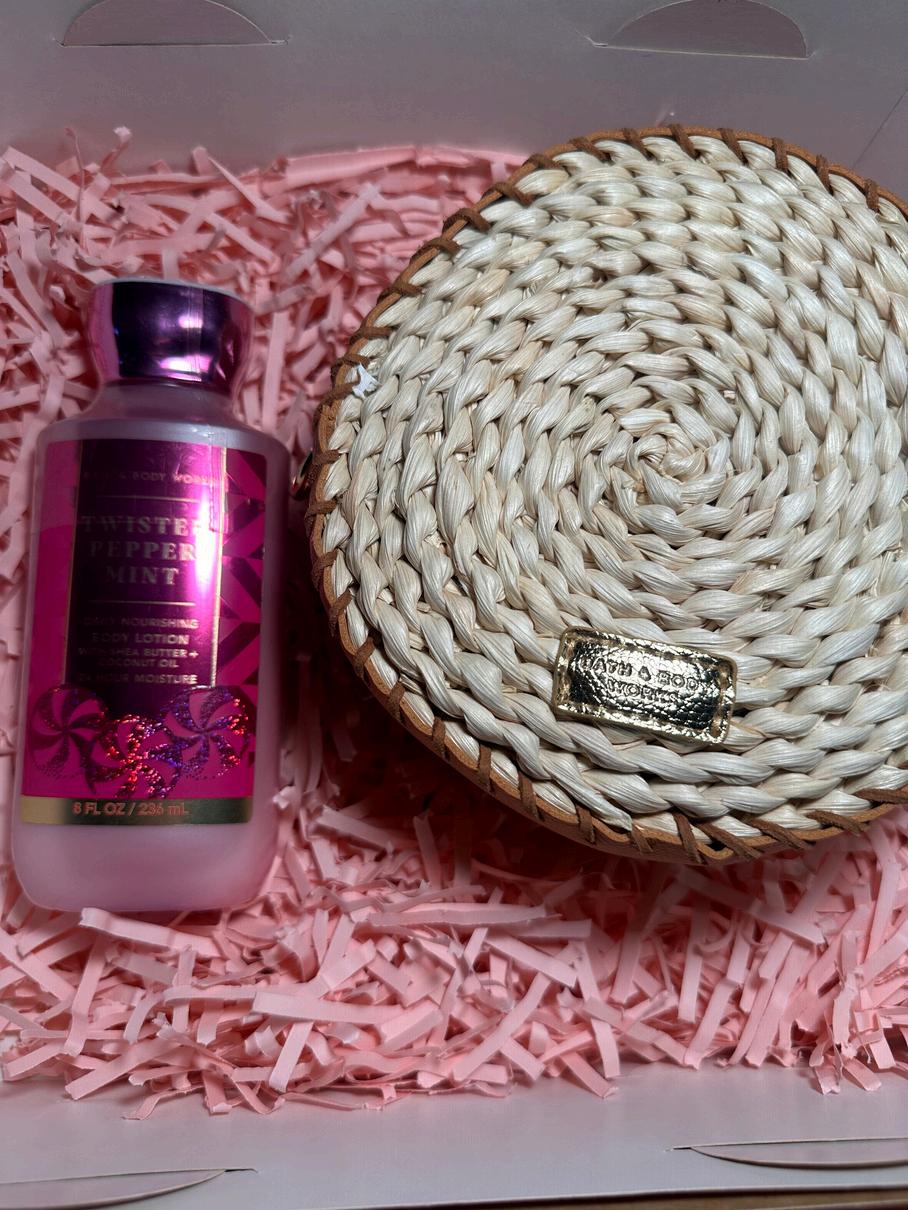 Consta de un bolso (woven crossbody) y una crema a escoger entre todo el catalogo, todo marca Bath and body, viene con una caja decorada con papel picado dos tarjetas del dia de la madre y un lazo.