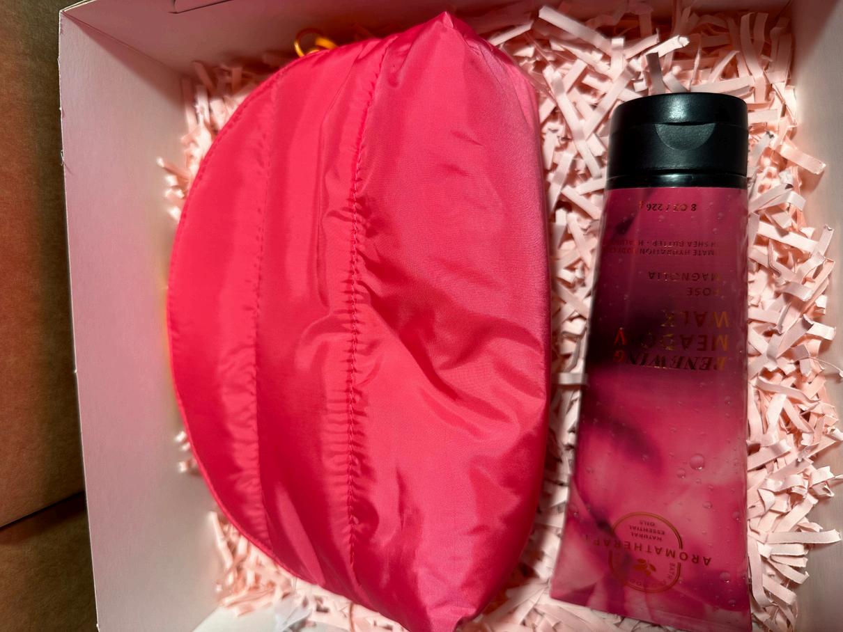 Consta de una cosmetiquera (puffy bag) y una crema a escoger entre todo el catalogo, todo marca Bath and body, viene con una caja decorada con papel picado dos tarjetas del dia de la madre y un lazo.