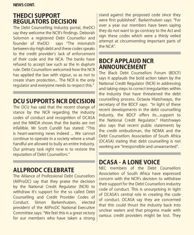 stand against the proposed code since they were first published”. Barkenhuisen says: ”For over a year our members have been saying The Debt Counselling Industry portal, theDCI they do not want to go contrary to the Act and say they welcome the NCR’s findings. Deborah sign these codes which were a thinly veiled Solomon a registered Debt Counsellor and attempt at circumventing important parts of founder of theDCI says “The mismatch the NCA”. between sky-high debt and these codes speaks to the credit provider’s lack of enforcement of their code and the NCA. The banks have BDCF APPLAUD NCR refused to accept law such as the in duplum ANNOUNCEMENT rule. Debt Counsellors welcomed how the NCR The Black Debt Counsellors Forum (BDCF) has applied the law with vigour, so as not to says it applauds the bold action taken by the create sham protection... The NCR is the only National Credit Regulator (NCR) in addressing regulator and everyone needs to respect this.” and taking steps to correct irregularities within the industry that have threatened the debt process. Octavia Hlatshwayo, the DCU SUPPORTS NCR DECISION counselling secretary of the BDCF says: “In light of these The DCU has said that the recent change of recent developments in the debt counselling stance by the NCR regarding the industry industry, the BDCF offers its....support to codes of conduct and recognition of DCASA the National Credit Regulator.” Hlatshwayo and the NMDA shows that the banks are not also says that recent public statements by infallible. Mr Scott Cundill has stated: “This the credit ombudsman, the NDMA and the is heart-warming news indeed ... We cannot Debt Counsellors Association of South Africa continue to operate in a society where a small (DCASA) stating that debt counselling is not handful are allowed to bully an entire industry. working are “irresponsible and unwarranted”. Our primary task right now is to restore the reputation of Debt Counsellors.”