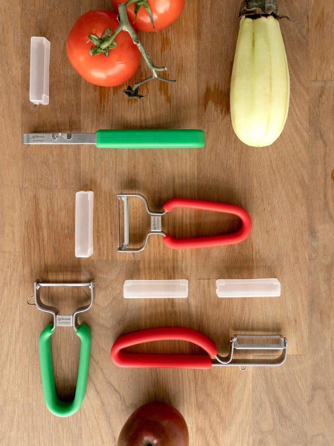 • Les éplucheurs avec poignée rouge sont dotés de deux lames dentelées, idéales pour les fruits et légumes mous