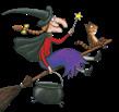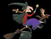 A helpful dog, bird and frog find the witch’s lost things, and they all hop on the broom for a ride. But this broomstick’s not meant for five and – CRACK – the broom snaps in two!