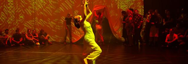 Garabari is a participatory dance gathering created with Elders and community leaders to share a creation story of water, land and the making of a river. The theatre becomes a shared dance floor where a pulsing techno beat blends with Wiradjuri song. Audiences are invited to join in through call and response and simple movement, gaining a direct sense of what a corroboree feels like today.