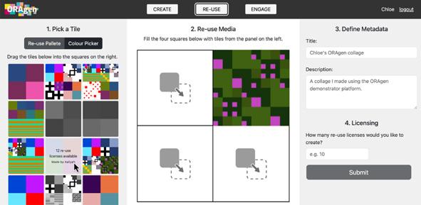ORAgen is a demonstrator built by DECaDE to probe public understanding and reception to the concepts of media tokenisation and rights. By allowing users to create, tokenise, license and remix simple colour collages, the web application demonstrates the technologies underlying the ORA framework. This framework enables creators and end-users to independently prove ownership of their digital assets and associated licenses; embed metadata including provenance data in a way that cannot be easily stripped or taken away; and design and issue specific and bespoke licenses for their digital creations.