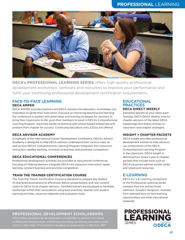 PROFESSIONAL DEVELOPMENT SCHOLARSHIPS DECA offers professional development scholarships to advisors for use at professional development conferences providing continuing education credit (CEU) in their field. The postmark deadline for applications is March 6, 2017. 27
