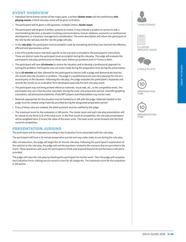 • Individual Series Events consist of two major parts: a written cluster exam and two preliminary roleplaying events. A third role-play event will be given to finalists. • The participant will be given a 100-question, multiple-choice, cluster exam.