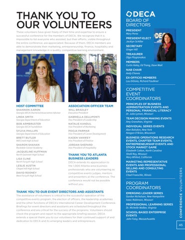 These volunteers have given freely of their time and expertise to ensure a successful conference for the members of DECA. We recognize that it is impossible to list everyone who assisted, but their efforts, visible throughout the entire conference, are appreciated. Because of them, DECA members are able to demonstrate their marketing, entrepreneurship, finance, hospitality and management knowledge in a quality, competitive learning environment.