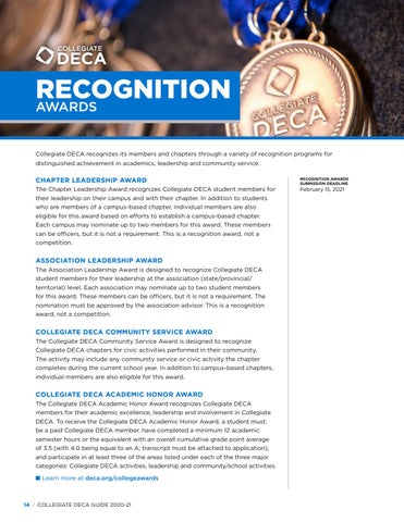 RECOGNITION AWARDS Collegiate DECA recognizes its members and chapters through a variety of recognition programs for distinguished achievement in academics, leadership and community service.