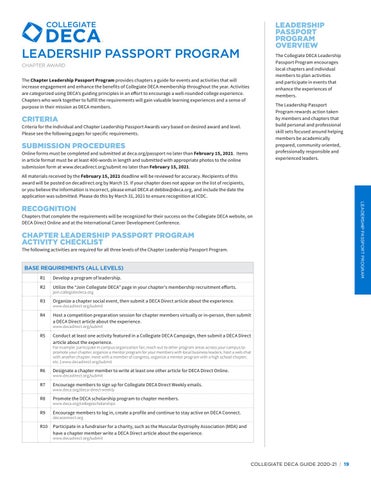 CHAPTER AWARD The Chapter Leadership Passport Program provides chapters a guide for events and activities that will increase engagement and enhance the benefits of Collegiate DECA membership throughout the year. Activities are categorized using DECA’s guiding principles in an effort to encourage a well-rounded college experience. Chapters who work together to fulfill the requirements will gain valuable learning experiences and a sense of purpose in their mission as DECA members.
