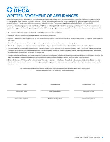 WRITTEN STATEMENT OF ASSURANCES Research and report writing are important elements of modern business activities. Great care must be taken to assure that the highest ethical standards are maintained by those engaging in research and report writing. To reinforce the importance of these standards, all written entries in Collegiate DECA’s Competitive Events Program must submit this statement as part of the entry. The statement must be signed by the Collegiate DECA member(s). I understand the following requirements as set forth by DECA Inc. for all Competitive Event entries containing a written component. These requirements are additional to any general rules and regulations published by DECA Inc. By signing this statement, I certify that all are true and accurate as they relate to this entry. 1. The contents of this entry are the results of the work of the team member(s) listed below. 2. No part of this entry has been previously entered in international competition. 3. This entry has not been submitted this year for international competition in any other Collegiate DECA competitive event, nor by any other student/team in this event. 4. Credit for all secondary research has been given to the original author and is stated as such in the written project. 5. All activities or original research procedures described in this entry are accurate depictions of the efforts of the team member(s) listed below. 6. I understand that Collegiate DECA has the right to publish this entry. Should Collegiate DECA elect to publish this entry, I will receive an honorarium from Collegiate DECA. Individuals/Teams with extenuating circumstances may appeal the right to publish the entry to the executive committee of the board of directors prior to submission of the project for competition. 7. I understand that the ideas and information presented in the written project and judge interaction will become public information. Therefore, DECA Inc., its staff, volunteers and organizational partners cannot reasonably be expected to ensure the security of my/our ideas and information. 8. DECA will retain one official copy of all written entries. The second copy may be picked up by the students or the advisor at a designated date, time and location. This information will be announced during the event briefing session. Unclaimed written entries/folios will not be returned to the students after the conference. This statement of assurances must be signed by all participants and submitted with the entry, or the entry will be given 15 penalty points. Hole punch and place in front of the written entry. Do not count as a page.
