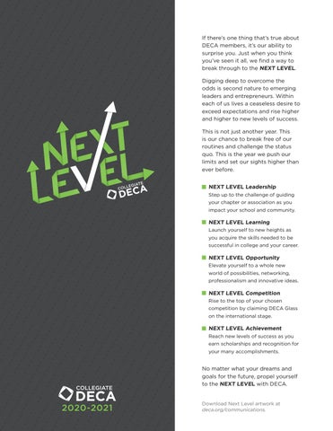 If there’s one thing that’s true about DECA members, it’s our ability to surprise you. Just when you think you’ve seen it all, we find a way to break through to the NEXT LEVEL. Digging deep to overcome the odds is second nature to emerging leaders and entrepreneurs. Within each of us lives a ceaseless desire to exceed expectations and rise higher and higher to new levels of success. This is not just another year. This is our chance to break free of our routines and challenge the status quo. This is the year we push our limits and set our sights higher than ever before. NEXT LEVEL Leadership Step up to the challenge of guiding your chapter or association as you impact your school and community.
