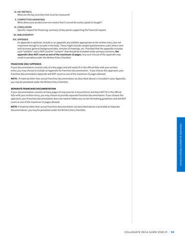 XII. BIBLIOGRAPHY XIII. APPENDIX An appendix is optional. Include in an appendix any exhibits appropriate to the written entry, but not important enough to include in the body. These might include sample questionnaires used, letters sent and received, general background data, minutes of meetings, etc. Provided that the appendix includes such “exhibits” and is NOT used for “content” that should be included under previous sections, the appendix does NOT count as one of the maximum 15 pages. Any such misuse of the appendix may result in penalties under the Written Entry Checklist. FRANCHISE ONLY APPENDIX If your documentation consists only of a few pages and will easily fit in the official folio with your written entry, you may choose to include an Appendix for franchise documentation. If you choose this approach, your franchise documentation Appendix will NOT count as one of the maximum 15 pages allowed. NOTE: If material other than actual franchise documentation (as described above) is included in your Appendix, you may be penalized under the Written Entry Checklist. SEPARATE FRANCHISE DOCUMENTATION If your documentation consists of many pages (it may even be in bound form) and does NOT fit in the official folio with your written entry, you may choose to provide separate franchise documentation. If you choose this approach, your franchise documentation does not need to follow any certain formatting guidelines and will NOT count as one of the maximum 15 pages allowed. NOTE: If material other than actual franchise documentation (as described above) is provided as Separate Documentation, you may be penalized under the Written Entry Checklist.