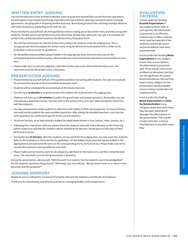Current entrepreneurs have worked to develop a plan to grow and expand their current business operations. Growth options may include franchising, expanding into new markets, opening a second location, licensing agreements, merging with or acquiring another business, diversifying product lines, forming strategic alliances with other businesses, expanding to the Internet, etc. Please familiarize yourself with all of the guidelines before reading any of the written entry and interacting with students. Penalty points (see Written Entry Checklist) have already been assessed. Your job is to evaluate the written entry and presentation based on the Written Entry Evaluation Form. • You will have 10 minutes to read the written entry before the students enter the judging area. This is an appropriate time to evaluate the written entry using the Written Entry Evaluation Form. Refer to the Evaluation Criteria section for guidelines. • On the bubble sheet provided, please bubble in the appropriate score and write the score on the corresponding line to verify accuracy. Please make sure not to exceed the maximum score possible for each item.