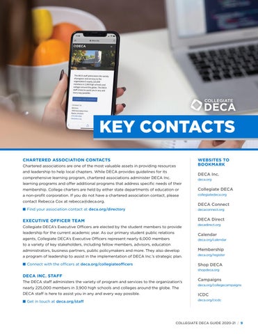 KEY CONTACTS CHARTERED ASSOCIATION CONTACTS Chartered associations are one of the most valuable assets in providing resources and leadership to help local chapters. While DECA provides guidelines for its