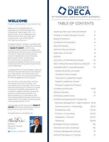 FROM YOUR EXECUTIVE DIRECTOR Welcome to Collegiate DECA’s International Career Development Conference. Washington, D.C., is a great site for you to celebrate your achievements, test your skills and network with over 2,000 DECA members and sponsors. Collegiate DECA members, advisors and business partners accepted the challenge to MAKE IT COUNT in 2013-14 by setting ambitious goals for engagement, membership and community involvement. The results have been extraordinary. Historic membership and conference participation levels, outstanding community service projects and incredible engagement across our social media platforms are great achievements to be celebrated. Collegiate DECA student leaders, advisors and business partners have championed our organization with enthusiasm and dedication. Each of us should thank them for their engagement and support. As I transition into retirement and the next phase of my life’s journey, I am reminded of how fortunate I am to have had the opportunity to spend my career in such an incredible organization. As a student, chapter advisor, association advisor and executive director, I’ve been blessed by my association with outstanding leaders at every level of our organization. No career could have been more rewarding than mine.