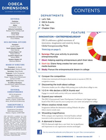 F E AT U R E INNOVATION + ENTREPRENEURSHIP DECA celebrates a global movement of innovation, imagination and creativity during Global Entrepreneurship Week. Think big on page 5. 6 Synergy: Plan your activity to promote entrepreneurship 7 iStart: Helping aspiring entrepreneurs pitch their ideas 8 Start-Up: Diane Keng creates her own social media business 10 Study: Pursue the entrepreneurial dream in college 12 Conquer the competition A three-time international champion shares secrets to success in DECA’s competitive events.