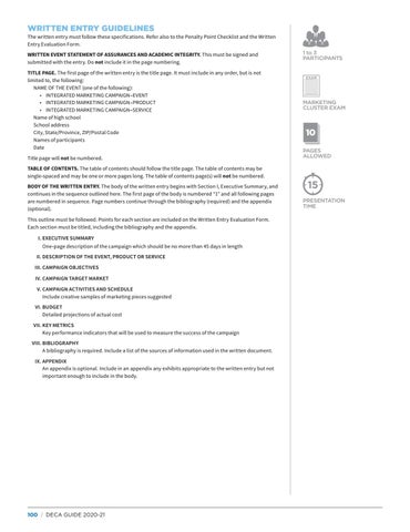 The written entry must follow these specifications. Refer also to the Penalty Point Checklist and the Written Entry Evaluation Form. WRITTEN EVENT STATEMENT OF ASSURANCES AND ACADEMIC INTEGRITY. This must be signed and submitted with the entry. Do not include it in the page numbering. TITLE PAGE. The first page of the written entry is the title page. It must include in any order, but is not limited to, the following: NAME OF THE EVENT (one of the following): • INTEGRATED MARKETING CAMPAIGN–EVENT • INTEGRATED MARKETING CAMPAIGN–PRODUCT • INTEGRATED MARKETING CAMPAIGN–SERVICE Name of high school School address City, State/Province, ZIP/Postal Code Names of participants Date Title page will not be numbered.