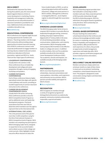 EDUCATIONAL CONFERENCES DECA conferences are targeted, highly focused learning experiences for members and advisors. They bring members into the larger DECA community while providing unique opportunities to extend classroom learning. Each of DECA’s conferences connects with corporate professionals to engage members in learning industry-related trends and content. Conferences take place at the local, association, regional and DECA Inc. levels. There are four major types of conferences. • LEADERSHIP CONFERENCES Usually held in the summer or fall, these conferences focus on leadership development and college and career preparation through a variety of engaging workshops and speakers. • CAREER PATHWAYS CONFERENCES Each of these conferences features highly specialized content that aligns with specific career pathways and courses, providing an excellent opportunity to connect classroom instruction to the conferences. • CAREER DEVELOPMENT CONFERENCES (CDCs) Usually held in the winter and spring, these conferences provide a venue for DECA’s Competitive Events Program as well as additional career and leadership development programs. Chartered associations host their own CDCs to determine which members earn the right to represent them at the International CDC.