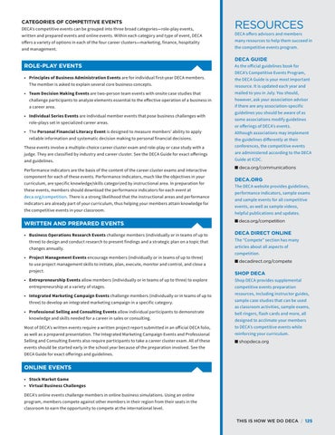 DECA DIRECT ONLINE The “Compete” section has many articles about all aspects of competition. ■ decadirect.org/compete