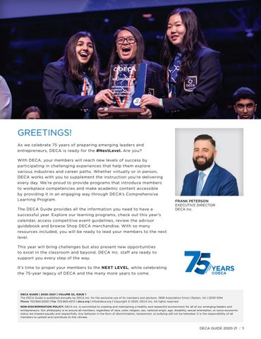 DECA GUIDE | 2020–2021 | VOLUME 52, ISSUE 1 The DECA Guide is published annually by DECA Inc. for the exclusive use of its members and advisors. 1908 Association Drive | Reston, VA | 20191-1594 Phone 703.860.5000 | Fax 703.860.4013 | deca.org | info@deca.org | Copyright © 2020, DECA Inc. All rights reserved. NON-DISCRIMINATION POLICY: DECA inc. is committed to creating and maintaining a healthy and respectful environment for all of our emerging leaders and entrepreneurs. Our philosophy is to ensure all members, regardless of race, color, religion, sex, national origin, age, disability, sexual orientation, or socio-economic status are treated equally and respectfully. Any behavior in the form of discrimination, harassment, or bullying will not be tolerated. It is the responsibility of all members to uphold and contribute to this climate.