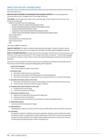 The written entry must follow these specifications. Refer also to the Penalty Point Checklist and the Written Entry Evaluation Form. WRITTEN EVENT STATEMENT OF ASSURANCES AND ACADEMIC INTEGRITY. This must be signed and submitted with the entry. Do not include it in the page numbering. TITLE PAGE. The first page of the written entry is the title page. It must include in any order, but is not limited to, the following: NAME OF THE EVENT (one of the following): • BUSINESS SERVICES OPERATIONS RESEARCH EVENT • BUYING AND MERCHANDISING OPERATIONS RESEARCH EVENT • FINANCE OPERATIONS RESEARCH EVENT • HOSPITALITY AND TOURISM OPERATIONS RESEARCH EVENT • SPORTS AND ENTERTAINMENT MARKETING OPERATIONS RESEARCH EVENT Name of high school School address City, State/Province, ZIP/Postal Code Names of participants Date Title page will not be numbered. TABLE OF CONTENTS. The table of contents should follow the title page. The table of contents may be single-spaced and may be one or more pages long. The table of contents page(s) will not be numbered. BODY OF THE WRITTEN ENTRY. The body of the written entry begins with Section I, Executive Summary, and continues in the sequence outlined here. The first page of the body is numbered “1” and all following pages are numbered in sequence. Page numbers continue through the bibliography (required) and the appendix (optional). This outline must be followed. Points for each section are included on the Written Entry Evaluation Form. Each section must be titled, including the bibliography and the appendix.
