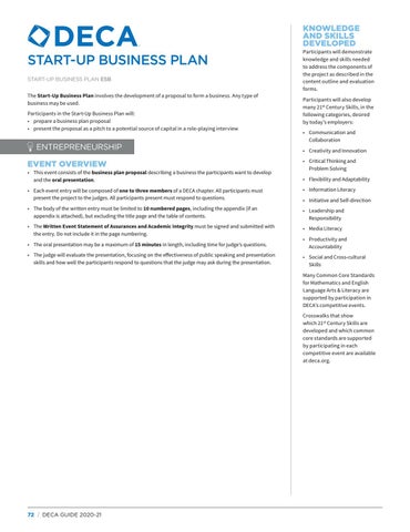 START-UP BUSINESS PLAN START-UP BUSINESS PLAN ESB The Start-Up Business Plan involves the development of a proposal to form a business. Any type of business may be used. Participants in the Start-Up Business Plan will: • prepare a business plan proposal • present the proposal as a pitch to a potential source of capital in a role-playing interview
