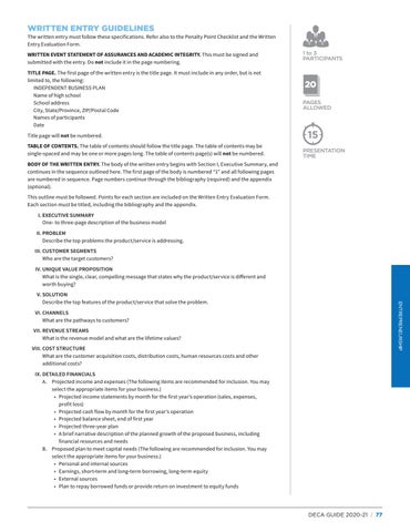 The written entry must follow these specifications. Refer also to the Penalty Point Checklist and the Written Entry Evaluation Form. WRITTEN EVENT STATEMENT OF ASSURANCES AND ACADEMIC INTEGRITY. This must be signed and submitted with the entry. Do not include it in the page numbering. TITLE PAGE. The first page of the written entry is the title page. It must include in any order, but is not limited to, the following: INDEPENDENT BUSINESS PLAN Name of high school School address City, State/Province, ZIP/Postal Code Names of participants Date