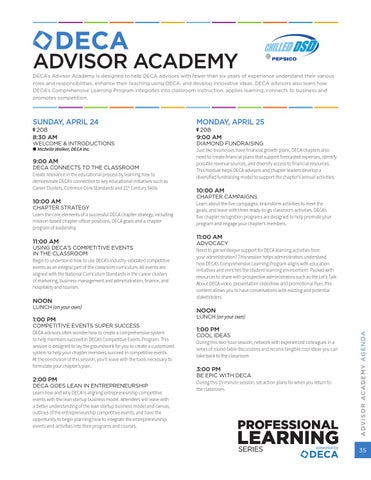 DECA’s Advisor Academy is designed to help DECA advisors with fewer than six years of experience understand their various roles and responsibilities, enhance their teaching using DECA, and develop innovative ideas. DECA advisors also learn how DECA’s Comprehensive Learning Program integrates into classroom instruction, applies learning, connects to business and promotes competition.