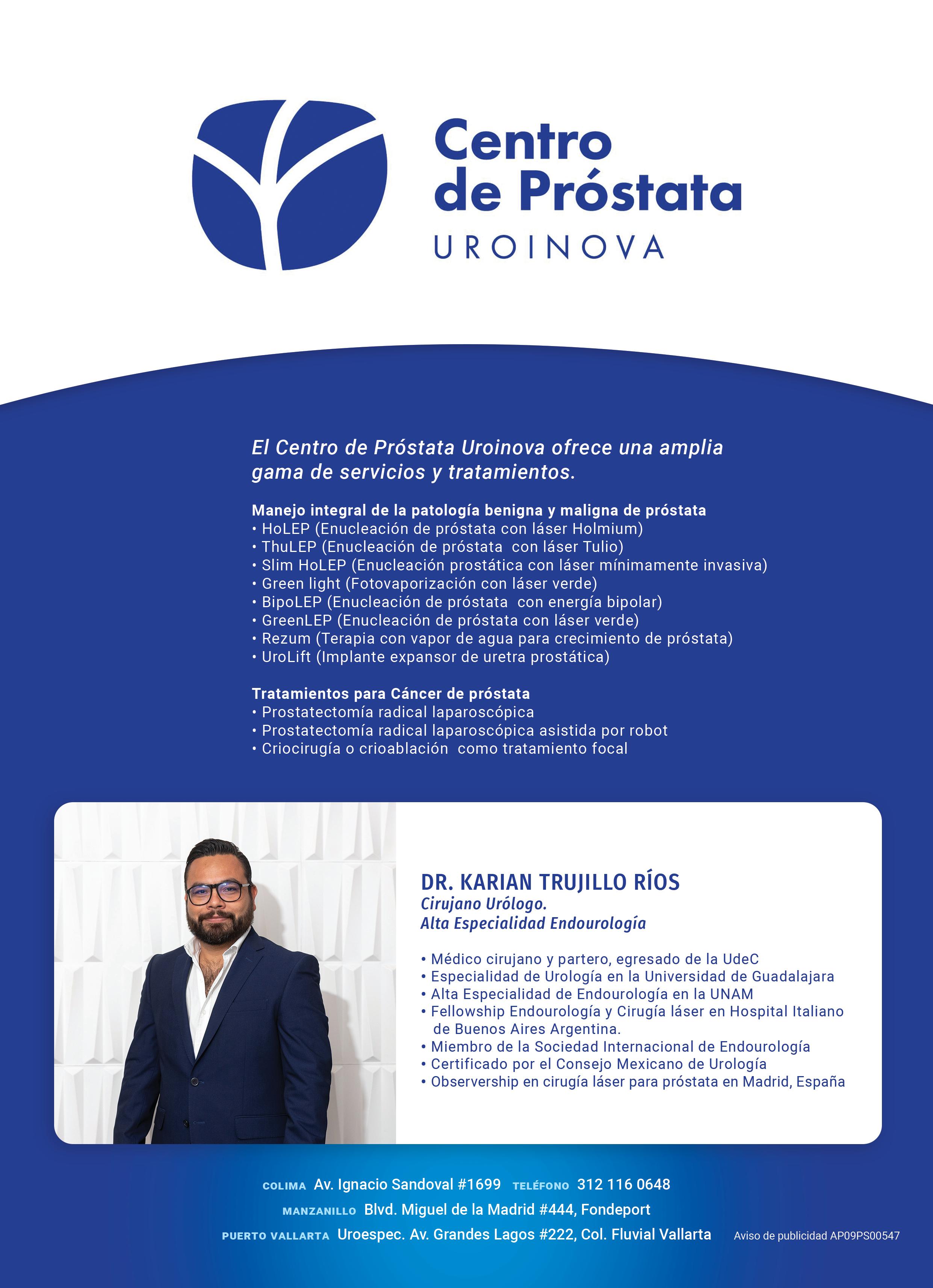 ElDr.KarianTrujilloRíos,líderdelequipomédi‐codeUroinova,esunprofesionalaltamente capacitadoyreconocidoenelcampodela Urología.Conunaformaciónacadémicasóli‐dayunaexperienciaclínicanotableha dedicadosucarreraainvestigaryaplicarlos avancesmásrecienteseneltratamientode lasenfermedadesdelapróstata.Suenfoque sebasaenlacombinacióndetécnicas quirúrgicasdeprecisiónconterapiasinno‐vadoras,siempreteniendoencuentaelbien‐estarylacalidaddevidadelpaciente.