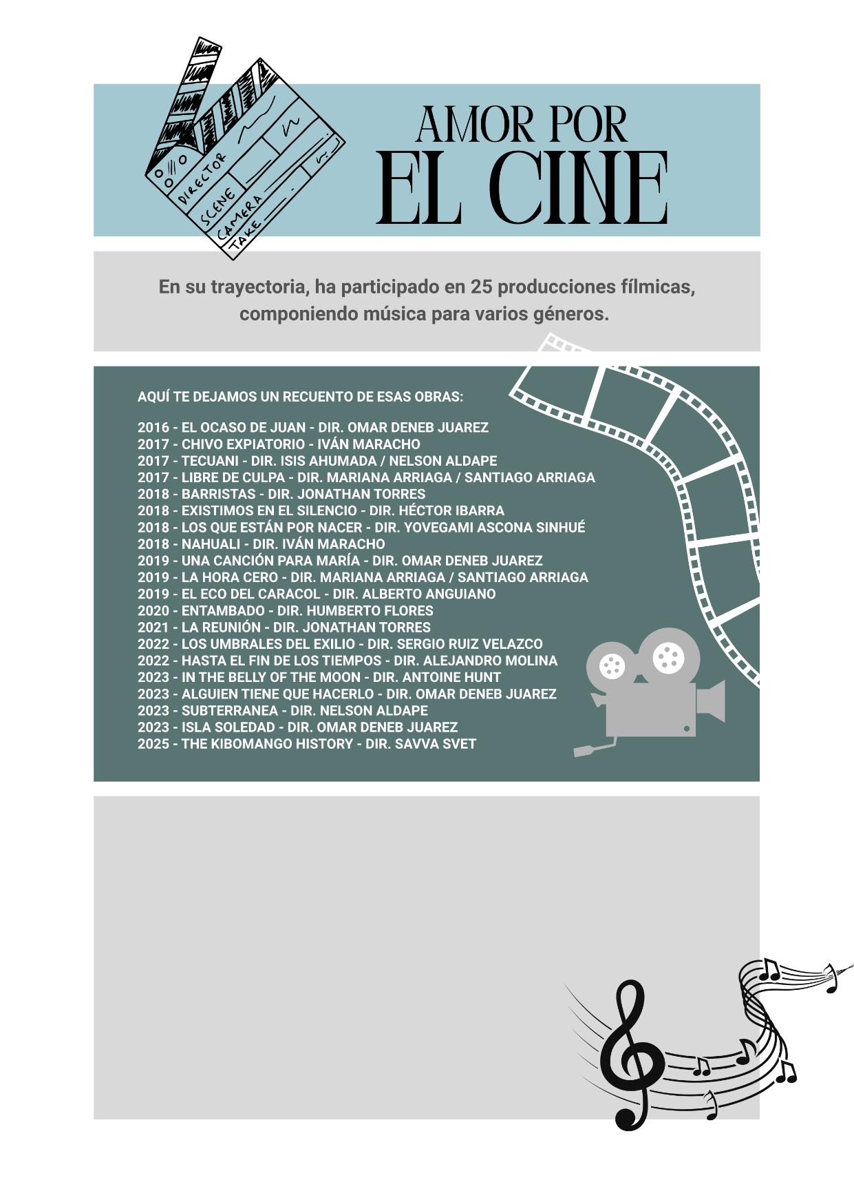 Hadesarrolladounacarrerasólidacomocompositor fílmico, colaborando en más de 25 proyectos dentro del cine independiente y de festivales.