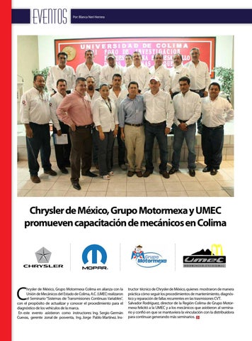 hrysler de México, Grupo Motormexa Colima en alianza con la Unión de Mecánicos del Estado de Colima, A.C. (UMEC) realizaron el Seminario “Sistemas de Transmisiones Continuas Variables”, con el propósito de actualizar y conocer el procedimiento para el diagnóstico de los vehículos de la marca. En este evento asistieron como instructores: Ing. Sergio Germán Cuevas, gerente zonal de posventa, Ing. Jorge Pablo Martínez. Ins-