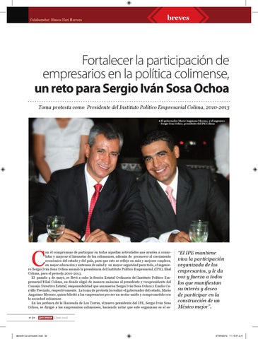 on el compromiso de participar en todas aquellas actividades que ayuden a consolidar y mejorar el bienestar de los colimenses, además de promover el crecimiento económico del estado y del país, para que este se refleje en más y mejores empleos, en mejor educación y sistemas de salud y en mayor seguridad para todo, el ingeniero Sergio Iván Sosa Ochoa asumió la presidencia del Instituto Político Empresarial, (IPE), filial Colima, para el periodo 2010-2013. El pasado 4 de mayo, se llevó a cabo la Sesión Estatal Ordinaria del Instituto Político Empresarial Filial Colima, en donde eligió de manera unánime al presidente y vicepresidente del Consejo Directivo Estatal, responsabilidad que asumieron Sergio Iván Sosa Ochoa y Emilio Carrillo Preciado, respectivamente. La toma de protesta la realizó el gobernador del estado, Mario Anguiano Moreno, quien felicitó a los empresarios por ser un sector unido y comprometido con la sociedad colimense. En los jardines de la Hacienda de Los Torres, el nuevo presidente del IPE, Sergio Iván Sosa Ochoa, se dirigió a los empresarios colimenses, haciendo notar que este organismo es el es32 33