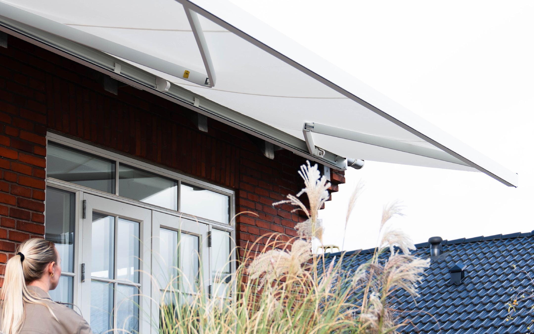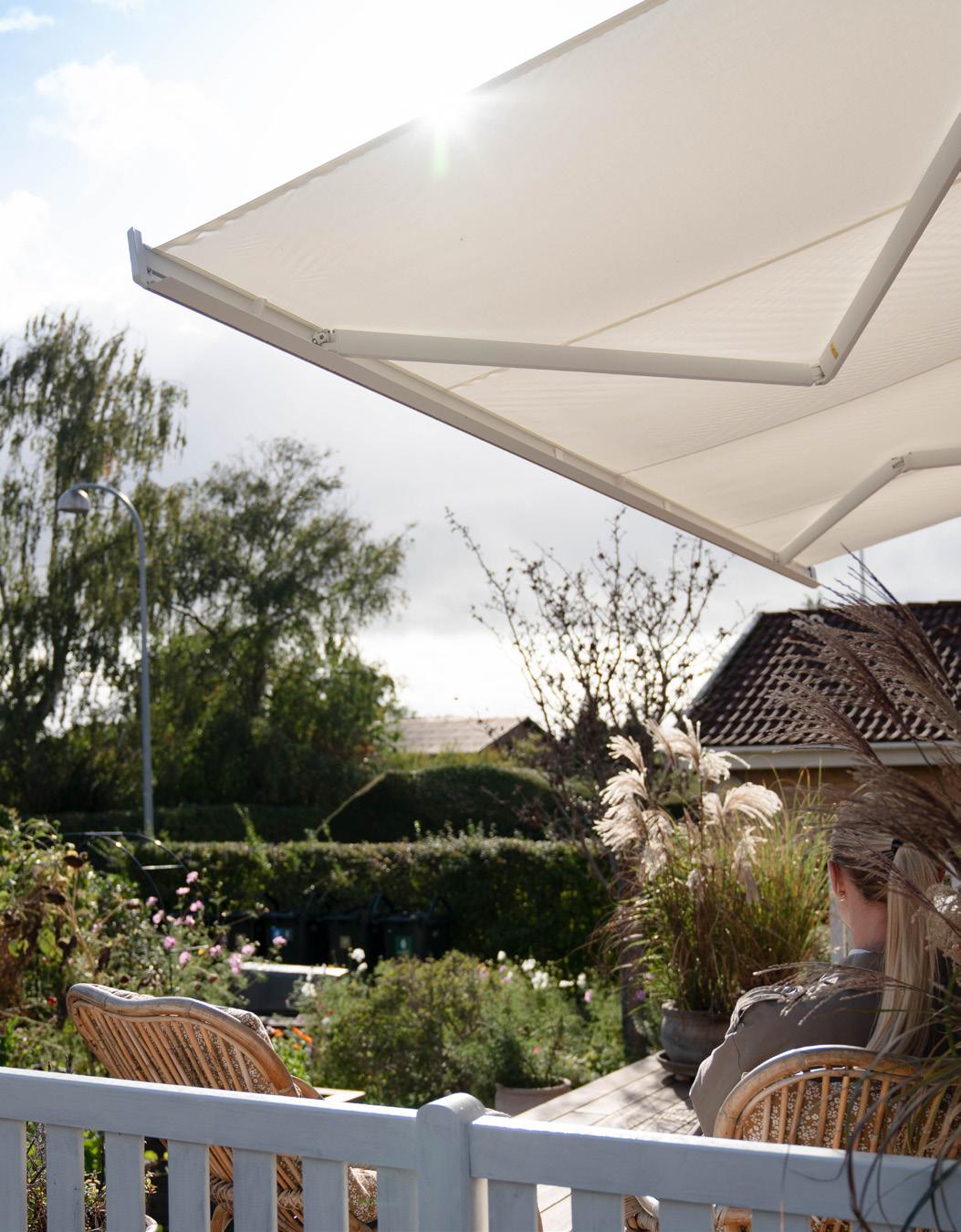 For Katja var det vigtigt, at markisen var diskret, når den ikke blev brugt. Derfor valgte hun en Kirsch Sigma markise med lukket kassette i aluminium. Den er både diskret og beskytter markisen mod vejr og vind. Valget faldt på en hvid markise med imprægnering, som holder sig flot og ren i mange år.
